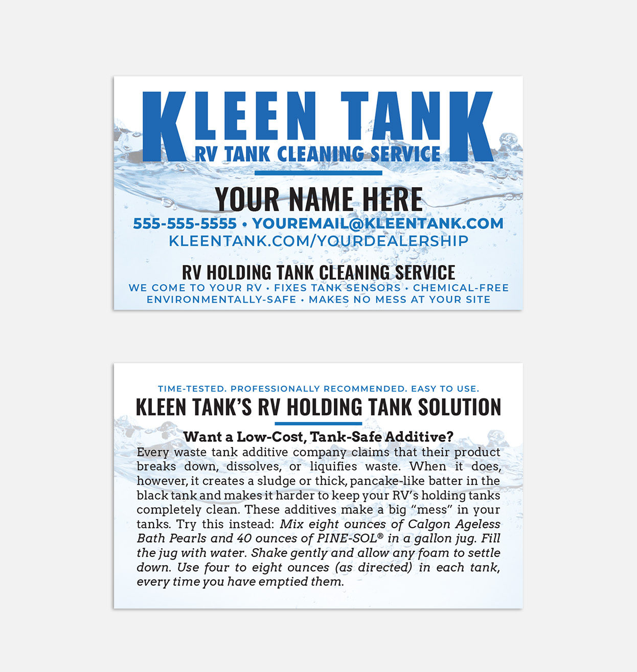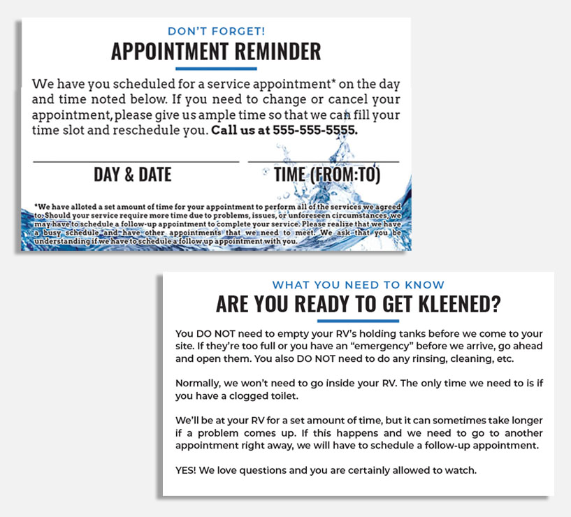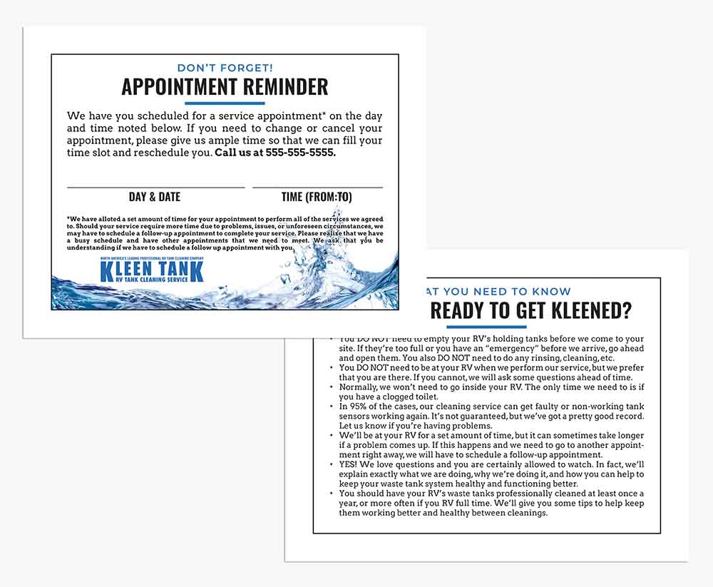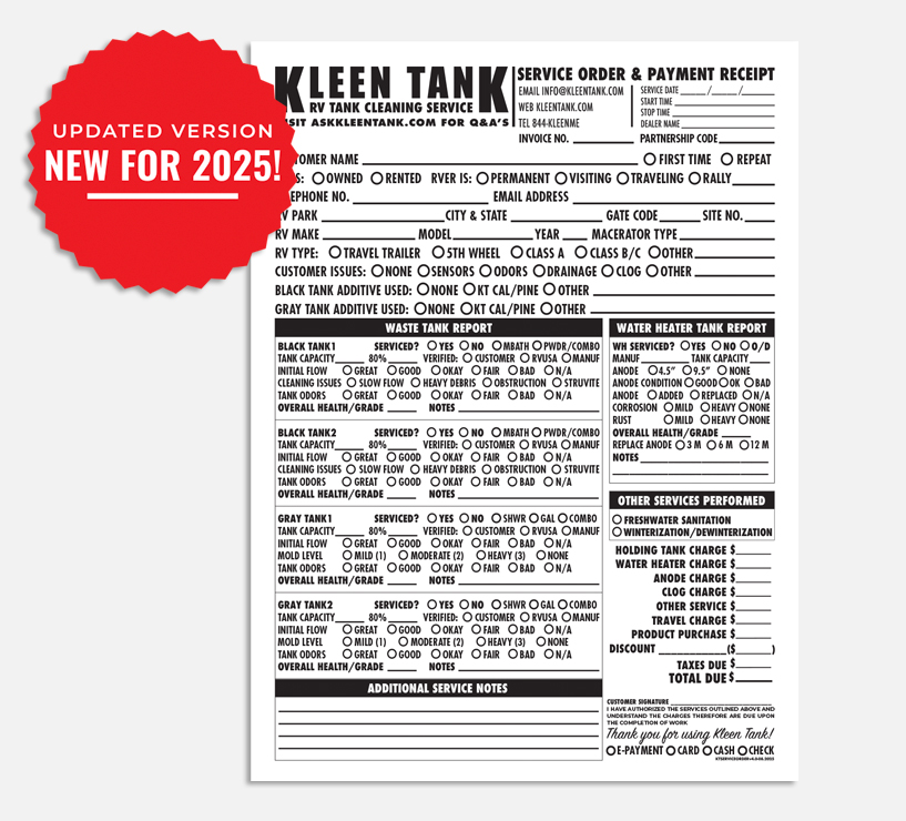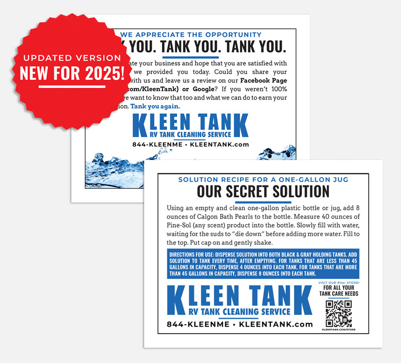 NOTE: All materials available for ordering and purchase on this dealer store are copywritten by Kleen Tank LLC and all rights thereof are reserved. The are made available only to current, active Kleen Tank dealers and any edits, copying, altering in part or whole, is prohibited under U.S. copyright law.